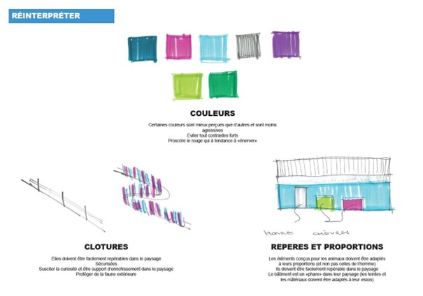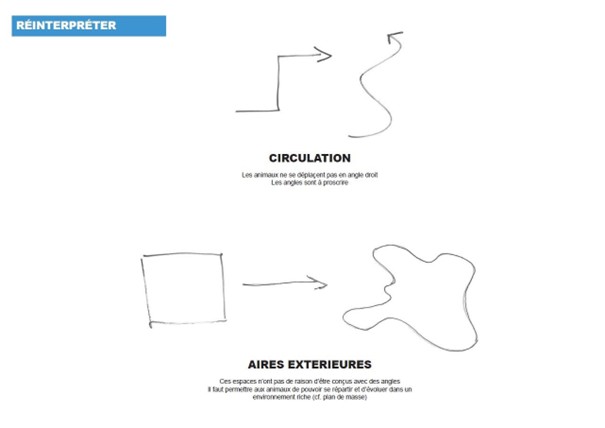 L’idée est de prendre les caractéristiques physiques et biologiques de l’animal comme nouvelles normes de construction ; et non plus concevoir un bâtiment d’élevage « classique » en y rajoutant par la suite des éléments d’enrichissement. L’animal et ses besoins doivent être pris en considération dès le début.
